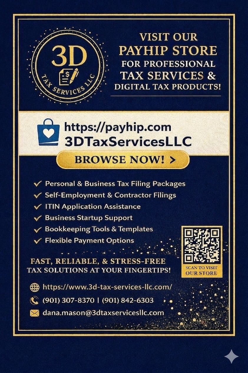 All 3D Tax Services — including tax prep, ITIN, business start‑up, application support, and mentorship — begin through our secure Payhip Store.